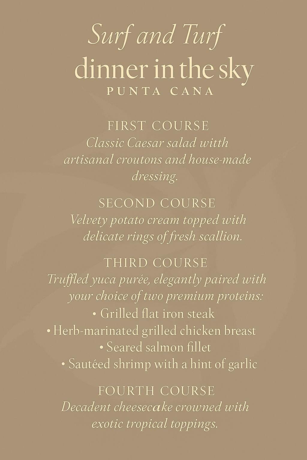 For one unforgettable hour, enjoy a 4-course international menu with unlimited mimosas while you float 50 meters in the air, surrounded by panoramic views and the gentle Caribbean breeze.